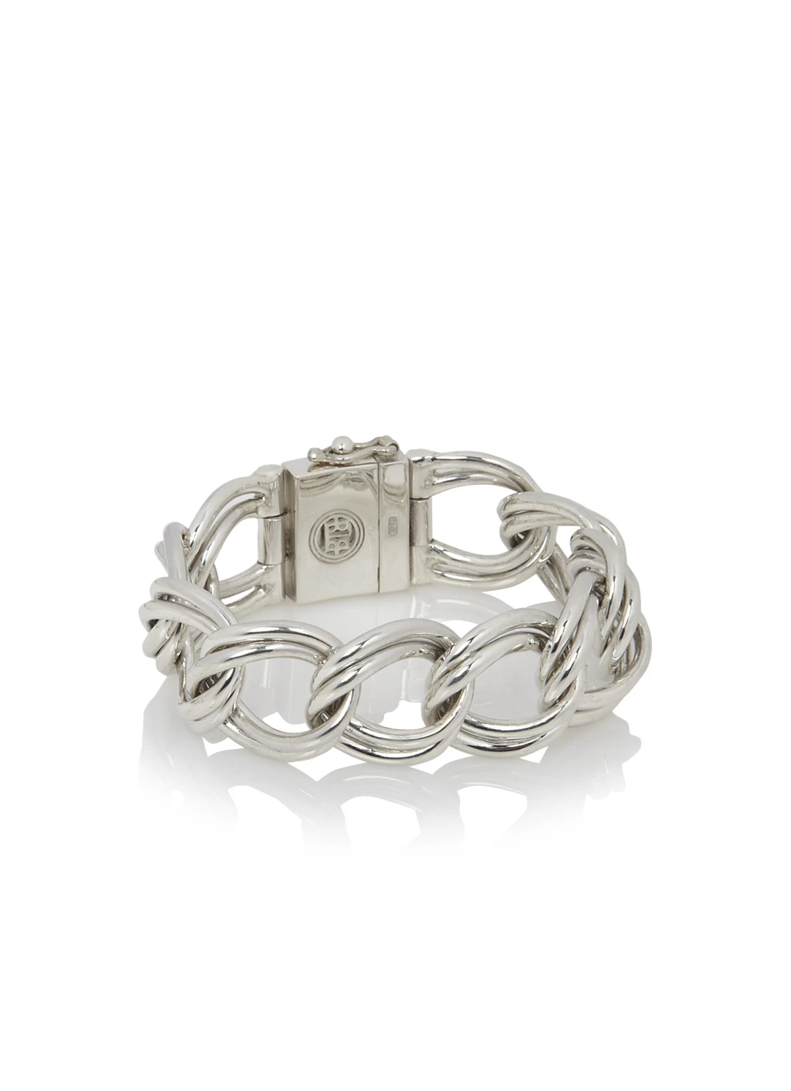 Buddha to Buddha armband in handgemaakte zilveren kwaliteit. De armband is uitgevoerd met dubbele schakels en sluit met een schuifsluiting met beveiliging.