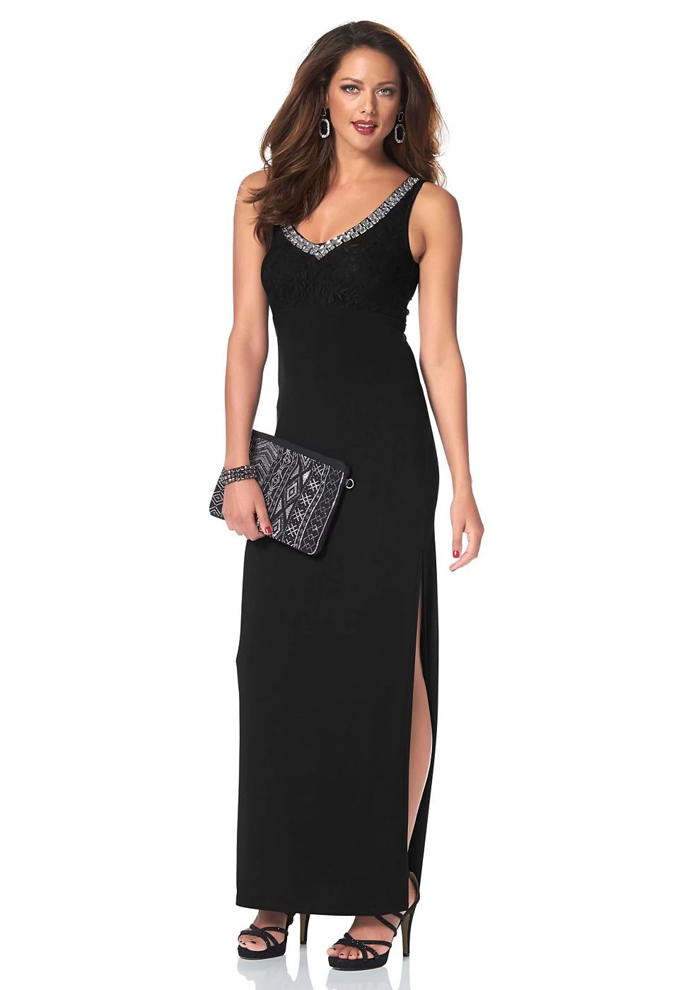 MELROSE Galajurk met siersteentjes, van MELROSE. Met filigraan verwerkte kanten inzet bij het decolleté. Diepe V-hals voor, ronde hals achter. Jurk in aangename stretch-jerseykwaliteit. Pasvorm: nauw aansluitende galajurk. Lengte: extra lang