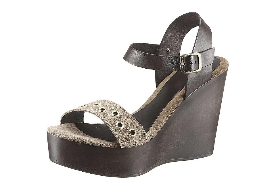 Sandaaltjes met sleehak, in een materialenmix van leer. Voering: ongevoerd. Zacht verdikte dekzool van leer, kunststof loopzool. Sandalen met 10 cm hoge hak, 3,5 cm dik plateau. Schoenwijdte: F (normaal). Gesp. Made in Spain. *Valt klein uit, bestel één maat groter.*